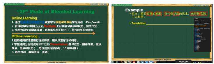 学院教学院长徐英老师顺利开展了钉钉直播平台上《汉英笔译》的第一周网络授课,利用线上线下混合式教学的教科研项目积累和经验,创新性引入“3P混合式学习模式”和课程学习档案,要求学生根据课程进度,用课程档案记录学习点滴和所思所想,帮助学生明确课程要求和学习模板,激发学生的自主学习热情。授课过程中,运用电脑进行直播授课的同时,在手机端关注学生的实时反应和表现,并与学生进行课堂互动,为学生呈现了一堂高质量的网络教学课。