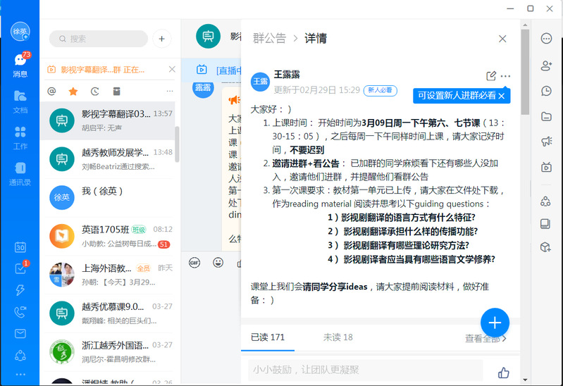 opta足球数据中文版翻译系笔译教研室教师王露露老师于2020年3月30日下午面向全校教师开了一堂《影视字幕翻译》的在线教学公开课,以钉钉直播的方式进行教学展示,共120多位教师观看了本次公开课。
