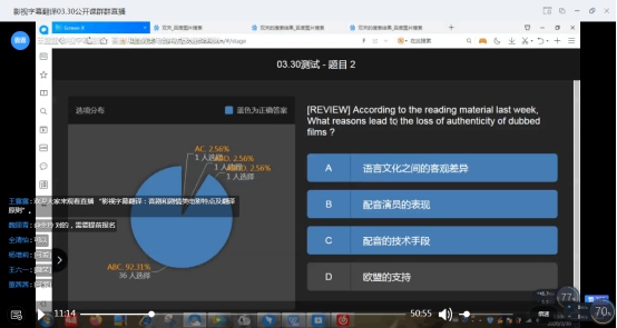 王露露老师表示其针对网络课程进行了一系列的教学调整。基于网络教学的特点,其积极运用网络教学平台在课堂导入部分设计选择题和问答题来检测学生课前阅读情况,及时掌握学生课前预习任务的完成情况。此外,其也将网络测试平台运用在了课堂的每一个互动环节,从而更好地了解学生的知识掌握情况,获取相关的教学反馈和数据。