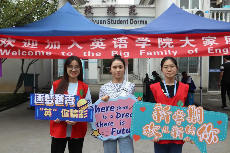 早上7点,迎新干部们早早地起床,整装待发。到了7点30分所有人员已经在圆顶集合。7点40分明确好每个人的任务以及注意事项,7点45全部志愿者都已经到岗等候新生的到来。争分夺秒,但却井然有序、有条不紊!英语人,好样的!志愿者们全天候提供接待服务,认真提供各种咨询,解答家长和新生的各种问题。南门,北门,西门,桃李苑,玫瑰苑,迎新志愿者们无处不在,耐心的讲解,细致的引导使迎新工作有序进行着。