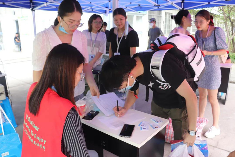 志愿者们穿梭于迎新现场,时刻等待着为新同学伸出援手,帮他们提行李,给他们带路。志愿者们的热情周到的服务,温馨甜蜜的笑容更是让同学们真切感受到来自学校的温暖,来自志愿者的关怀与照顾。