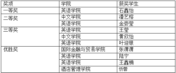 本次大赛得到了全校同学的热烈响应,同学们积极参与备赛、锻炼专业技能、认真研究总结,展现了我校学生优秀的学习风貌。经过各个二级学院层层选拔,共有13个参赛作品进入最终决赛环节。本次教学技能大赛决赛邀请了教学督导钱纪芳教授、英语系主任黄婷老师、英语系副主任楼凌玲老师、学前教育教研室主任章岚老师以及双语教育教研室郑盛娜老师担任比赛评委。评委们针对教学视频、教学设计及课件三部分对参赛作品进行打分。经过激烈角逐,本次比赛最终评选出一等奖1名,二等奖2名,三等奖3名,优胜奖4名。比赛结果如下: