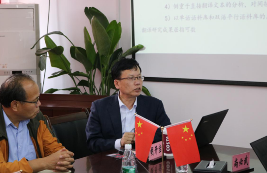胡开宝教授从自身多年从事语料库相关研究的经验和学术生涯谈起,娓娓道来,深入浅出地介绍了语料库的的发展历史,指出多语平行语料库将会是未来的重大选题及重大发展方向,并表示由于语料库翻译学研究很少以多语语料库的应用为基础,语料库翻译学关于翻译共性和翻译规范等领域研究的代表性尚有较大的上升空间。通过举例,胡开宝教授指出语料库方法和文学研究结合具有很大的研究空间,可以催生很多领域,并勉励在座师生树立创新意识,开展与多语语料库相关的研究活动。讲座尾声,胡开宝教授与老师们展开了深刻、精彩的讨论。在场老师们对胡开宝教授的深厚学识感慨不已,同时也积极发表了自身见解与看法。