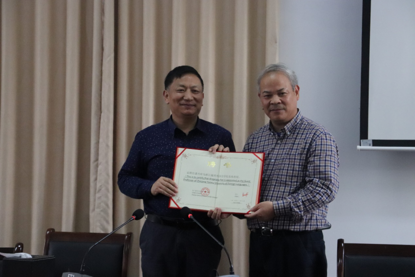 徐英副院长对潘兴祥专家精彩的演讲表示感谢,他向大家提出美好期望,望广大同学能够结合新时代大国复兴的伟大构想,学好我们的专业,讲好我们的语言,了解、学习中国传统文化,并将其融入语言中去讲好黄酒故事,讲好绍兴故事,讲好中国故事,让中国文化走出去。