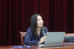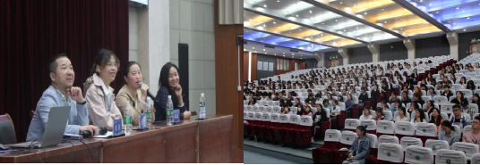 接下来,三位系主任拿出十八般武艺,各显神通,分别就各自专业的专业定位、特色优势、课程设置以及未来可能的发展方向等做了全面的介绍。英语系系主任黄婷老师从专业培养目标、基本情况、核心课程和实践活动四个方面对英语专业做了全面的介绍,强调“用世界的语言,讲好中国故事”。商英系系主任陈琨琨老师开篇先解答了大家对商英专业的误解,强调商英着重于培养“英语+商科思维”,并用往届优秀校友的典型例子向学生展示商英专业的优势和前景。翻译系系主任吴双姣老师引用季羡林先生的话指出翻译的价值与作用,并详细介绍了翻译专业作为国家级一流专业所具有的优势和特色,高大上的翻译类课程设置和先进的翻译实验室和同传室设备,令同学们向往不已。不仅如此,吴主任还通过视频,把已经毕业的优秀翻译学长学姐“邀请”到现场为翻译专业“拉票吸粉”。