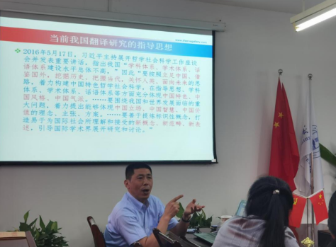 此外,傅教授指出当今翻译的社会特征是全球化、大数据、专业化、技术化、职业化、规范化与项目化,并指出中国翻译社会的特征是结合一带一路倡议,让中国文化走出去,讲好中国故事,做好国际传播。傅教授还提到当前我国翻译研究的指导思想是2016年5月17日,习近平总书记主持召开哲学社会科学工作座谈会中的重要讲话。
