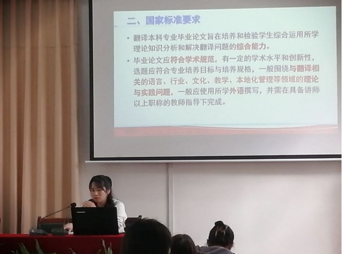 翻译系副主任谌莉介绍了翻译系毕业生基本情况,提出了翻译本科专业毕业论文的国家标准以及翻译实践报告的具体格式、提出了指导要求以及对老师指导工作的建议。