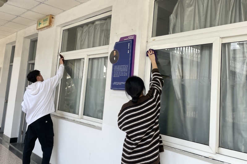 活动开始后,各项工作都有条不紊地进行着。各班班委一起对各班级人员进行了详细的分工。同学们集体协作,合理分工,明确任务,扫地、拖地、擦窗户、整理讲台、排列桌椅等,做到了地面无污渍,墙面无划痕,桌面整齐。