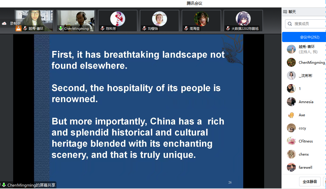 陈大使首先指出,英语演讲要把握重点,言之有物,重吸引而非说教。在跨文化语境下,讲好中国故事,传递中国声音,务必做到沉着自信,适当发挥幽默感的巧妙作用。此外,演讲者还要考虑英汉语言差异,建立文化互通桥梁,引起受众共鸣共情。陈大使以外交部翻译司张璐口译工作的出彩表现为案例,鼓励年轻学子提升自信,通过持续不断的学习和历练,扩展视野,挖掘自身潜力。