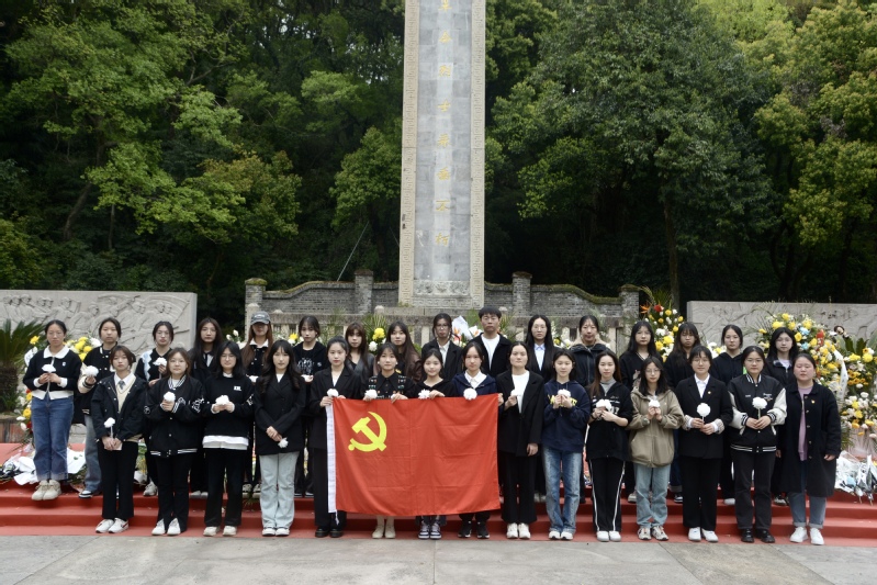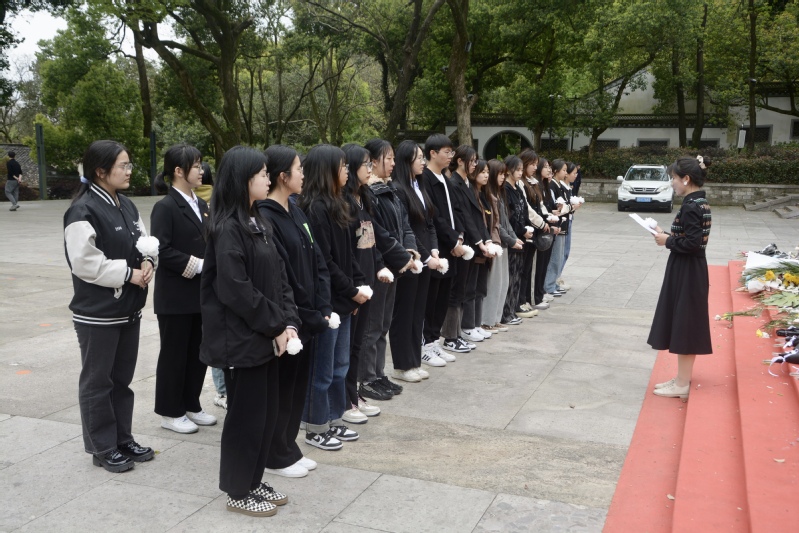 在烈士纪念碑前,全体学生肃立、默哀,表达对先烈的缅怀之情。入党积极分子代表鲍诵涵同学发言,她表示作为青年大学生,要努力学习、明辨是非、报效祖国,全面提高自身素质,学习先烈们不屈不挠、坚韧担当、艰苦奋斗的革命精神,为民族振兴、国家富强而努力奋斗。接着,大家迈着整齐而又沉重的步伐,缓缓走向纪念碑,向烈士墓敬献了亲手制作的洁白纸花,表达对革命先烈的深深悼念之情。